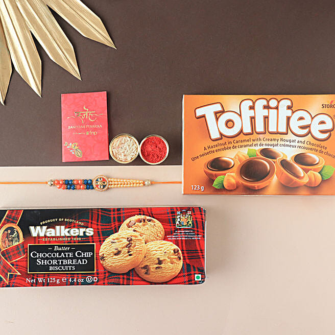Sneh Peach Motif Rakhi & Sweet Hamper