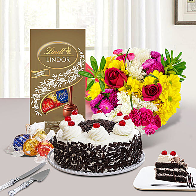 Flowers And Black Forest Cake Sweet Combo