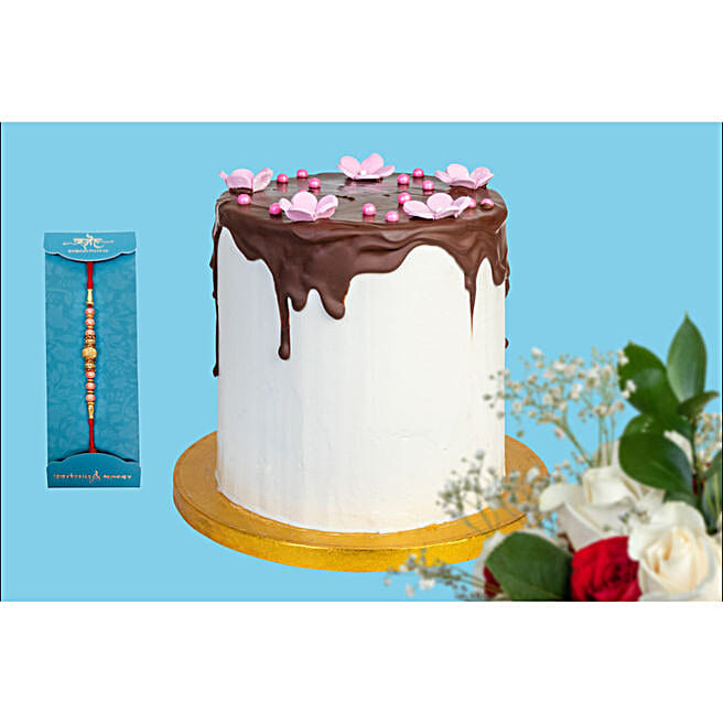 Pink Cherry Blossoms Red Velvet Cake & Golden Pearl Rakhi