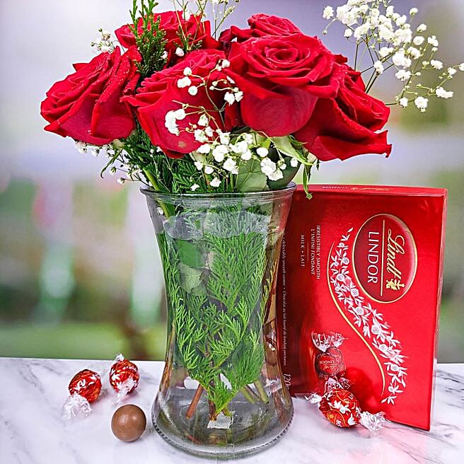 Romantic Red Roses Bouquet And Lindt Chocolates