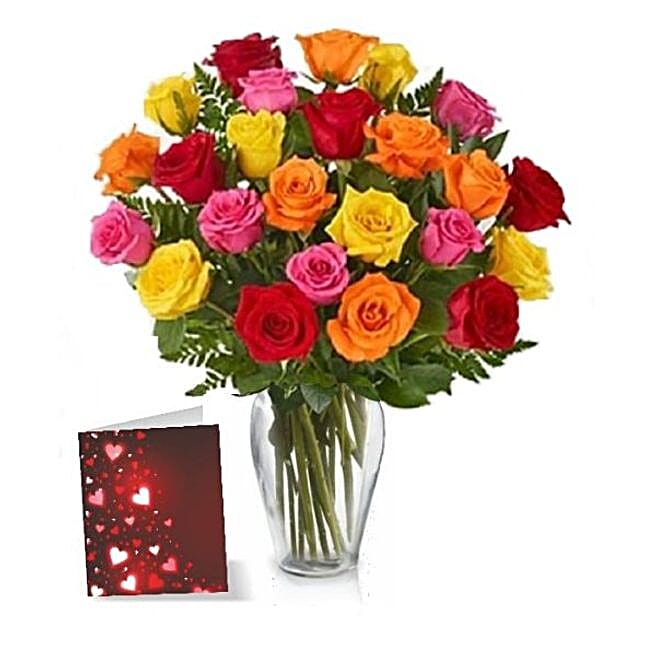 Vibrant Mixed Roses Vase And Card
