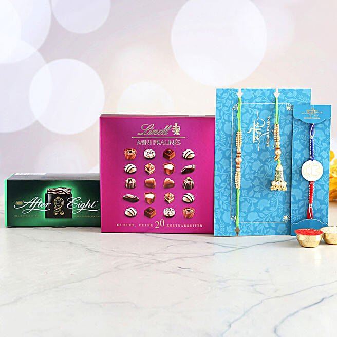 3 Designer Rakhis And Flavourful Chocolate Hamper