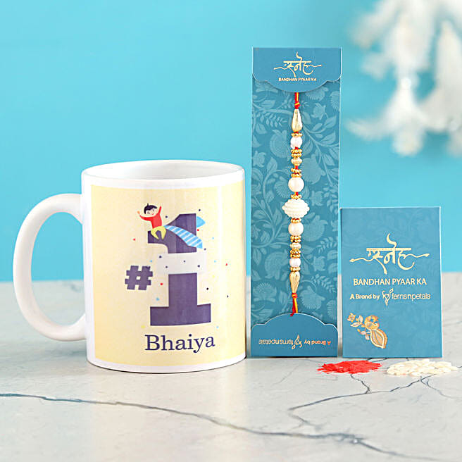 White Pearl Rakhi And No 1 Bhaiya Mug Combo