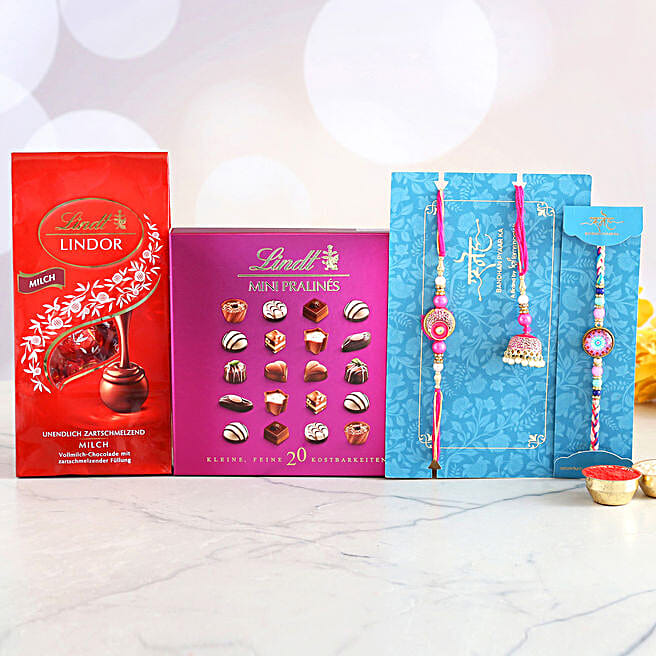 3 Classy Rakhis And Delectable Chocolate Hamper