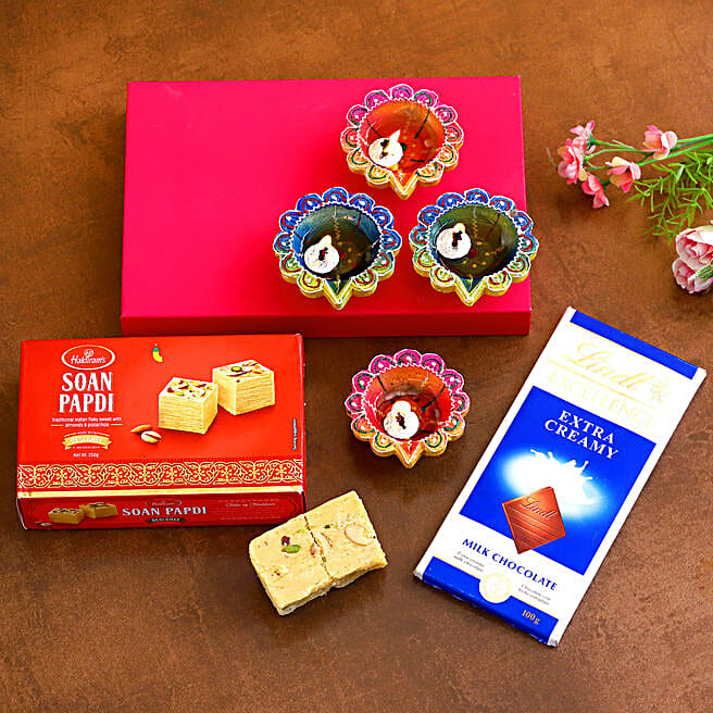 Designer Diwali Diyas With Lindt Chocolate And Soan Papdi