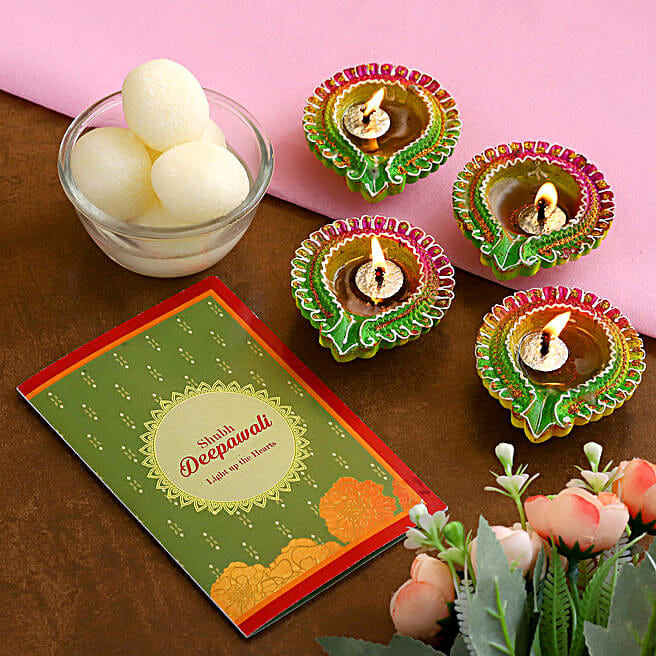 Diwali Floral Diyas With Greeting Card And Rasgulla