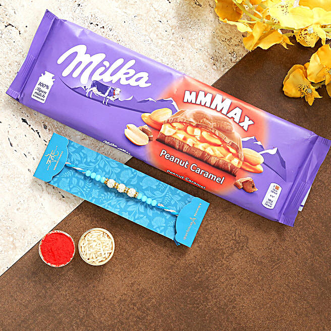 Sea Blue Pearl Rakhi And Milka Peanut Chocolate