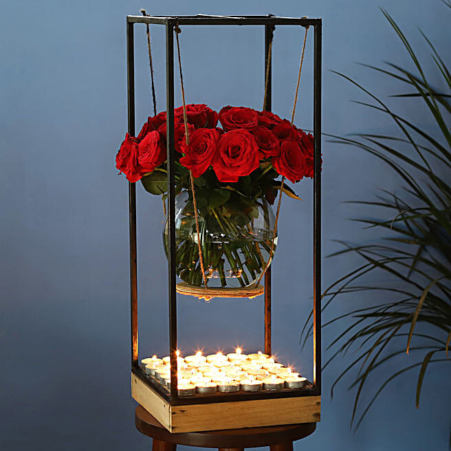 40 Red Roses in Fishbowl With Iron Stand