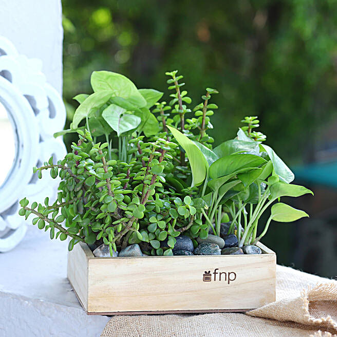 Jade N Money Plant Wooden Base Terrarium