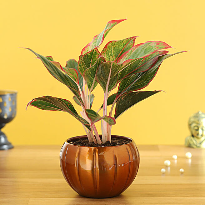 Pink Aglaonema Plant In Copper Pumpkin Pattern Pot
