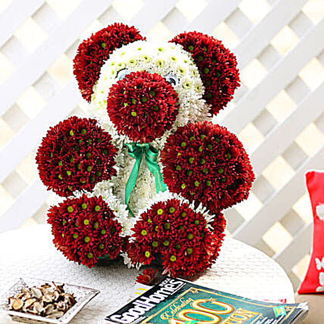 Red & White Chrysanthemums Teddy Bear Arrangement