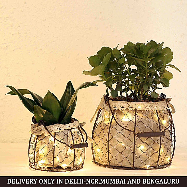 Set of 2 Green Plants In Exclusive Lights Decked Base