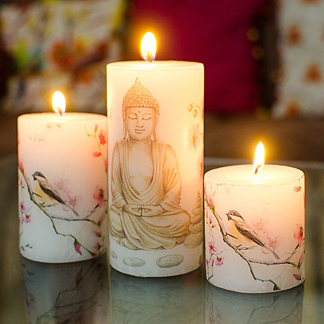 Set Of 3 Buddha Print Pillar Candles Gift Set