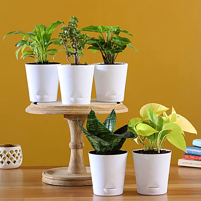 Set Of 5 Plants In White Self Watering Pots