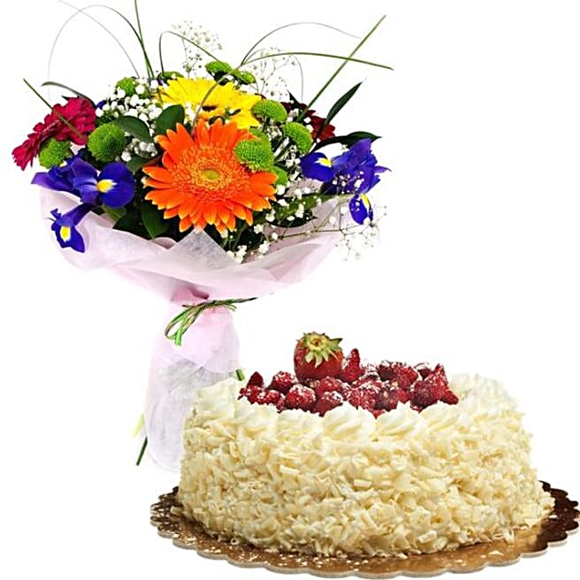Mixed Flowers Bouquet And Strawberry Cream Cake