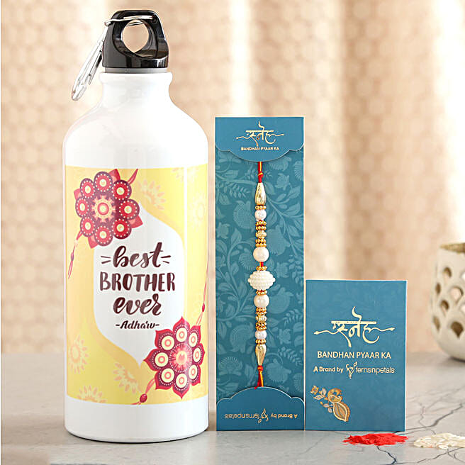 White Pearl Rakhi And Personalised Bottle Combo