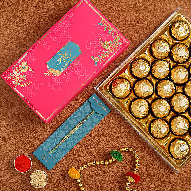Green Pearl Designer Rakhi And 16 Pcs Ferrero Rocher