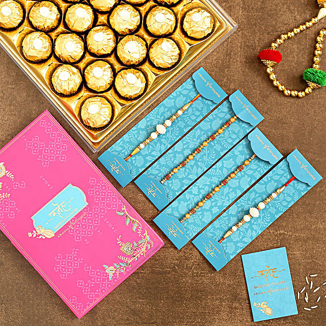 Pearl Studded Mauli Rakhi Set And 16 Pcs Ferrero Rocher