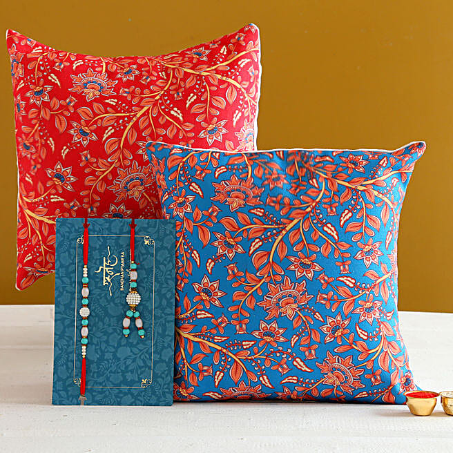 Blue Lumba Rakhi Set And 2 Floral Print Cushions