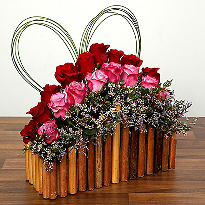 Red and Purple Roses In A Wooden Base OM