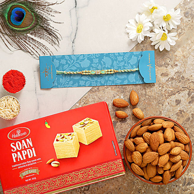 Green Pearl Rakhi With Soanpapdi And Almonds