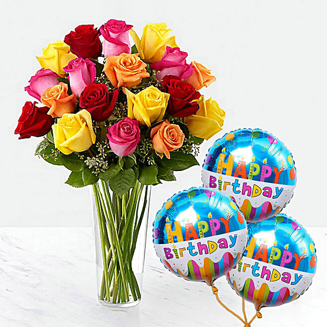 Vivid Roses Bunch With Birthday Balloon