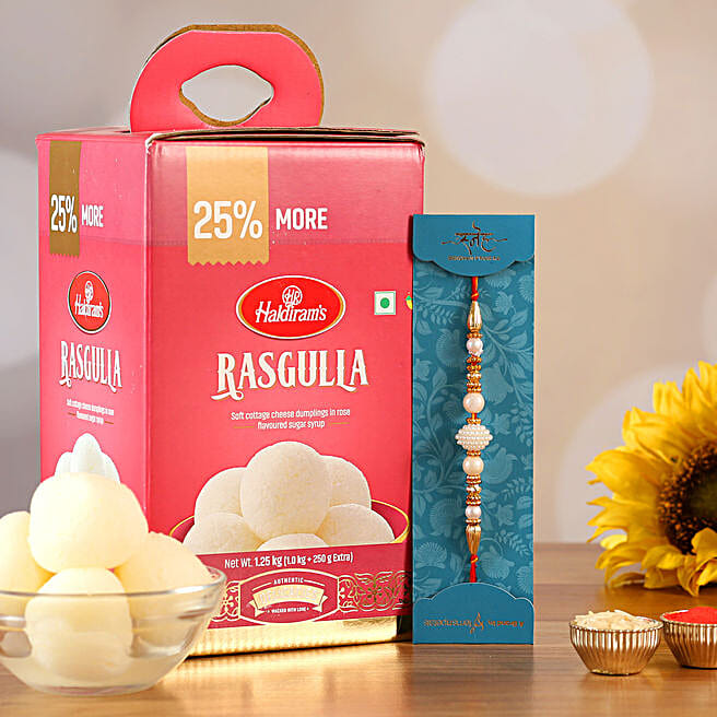 White Pearl Mauli Rakhi And Rasgulla