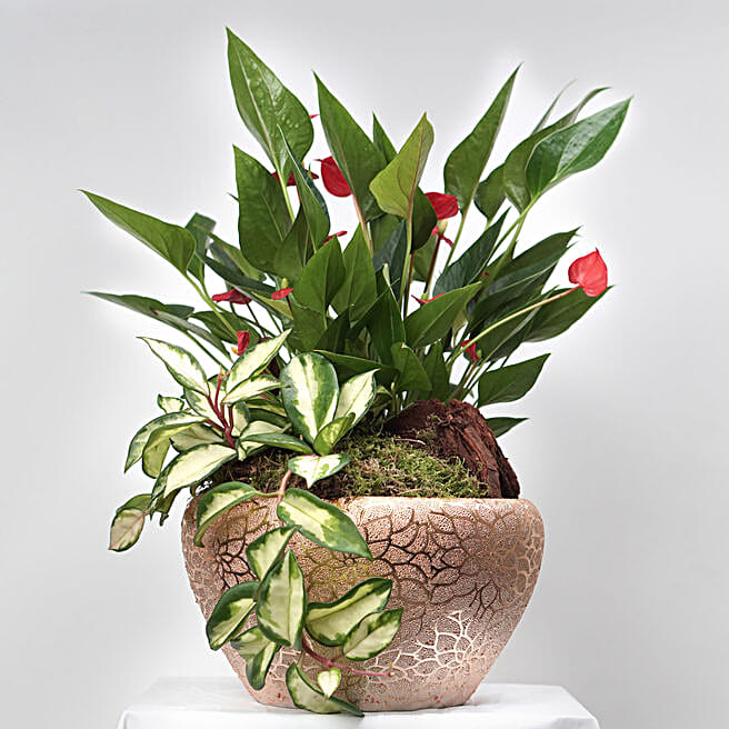 Anthurium & Hoya Carnosa Plant In Golden Pot