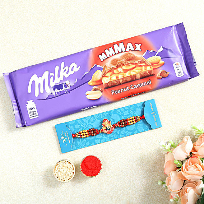 Ganesha Rudraksha Rakhi And Milka Peanut Chocolate