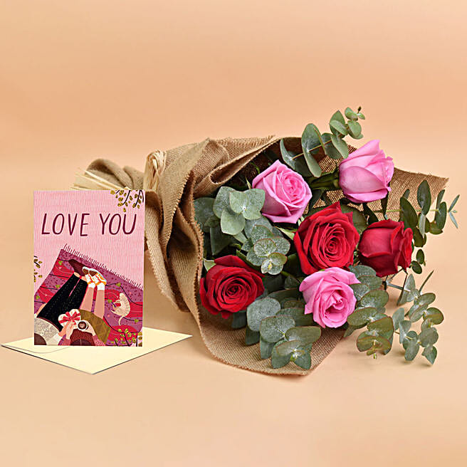 3 Pink 3 Red Roses Valentine Bouquet With Greeting Card