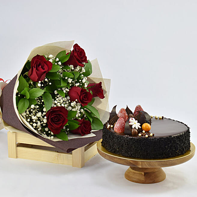 Elegant Rose Bouquet With Chocolate Fudge Cake