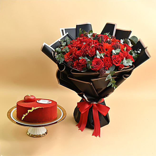 Joyful Red Bouquet With Cake