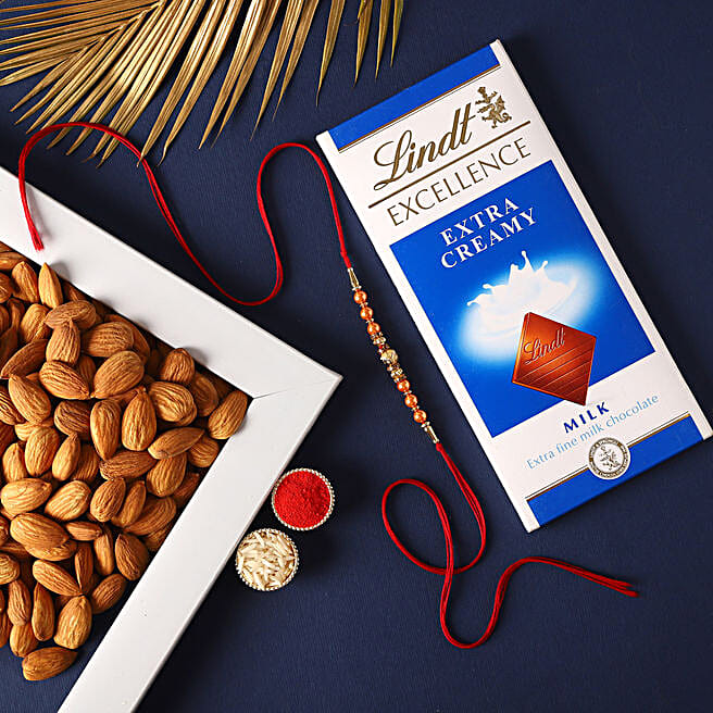 Rose Gold Pearl And Beads Rakhi with Lindt Bar and Almonds