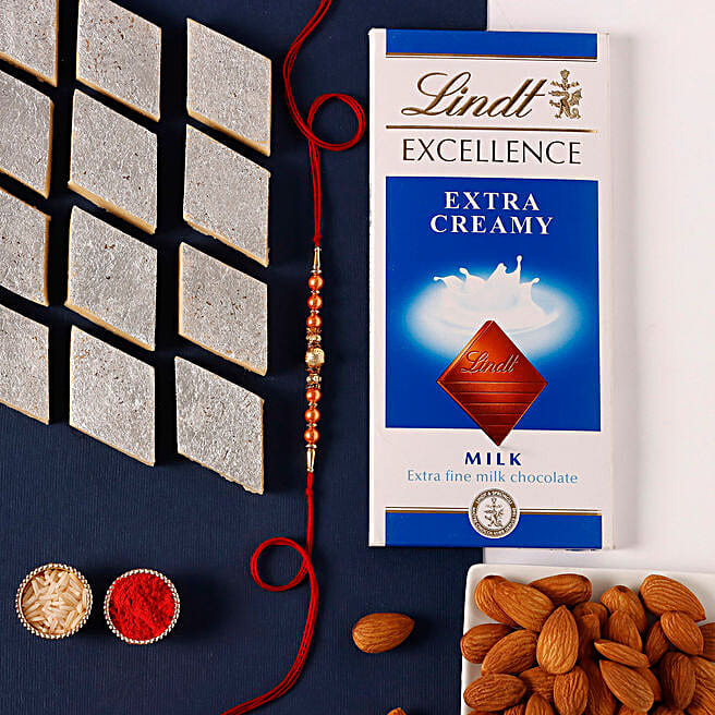 Rose Gold Pearl And Beads Rakhi with Lindt Bar and Kaju Katli