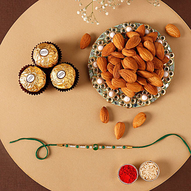 Sneh Fancy Green Rakhi with 3 Pcs Ferrero Rocher and Almonds