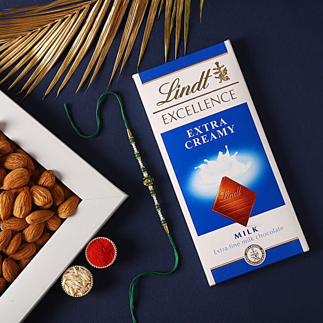 Sneh Fancy Green Rakhi with Lindt Chocolate Bar and Almonds