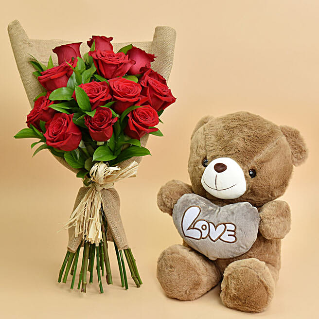 Lovely 12 Roses Bouquet And Teddy