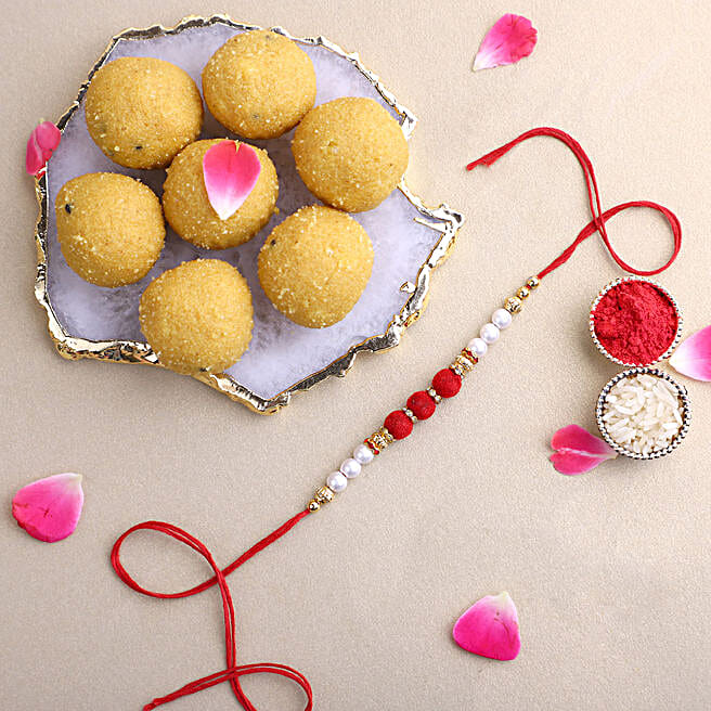 White Pearl And Velvet Beads Rakhi with 500 grams Besan Ladoo