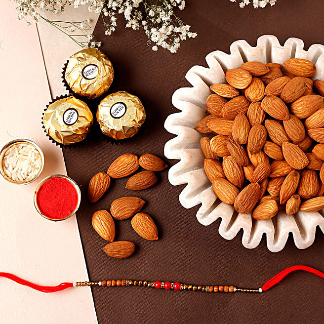 Red Beads Designer Rakhi With Almonds & Ferrero Rocher